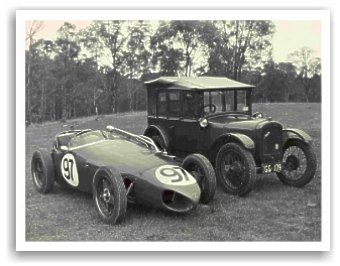 John Whitehouse's Austin 7 racing car with Doug Veel's 1927 Chummy outside Schwerkolt Cottage, 1960. Photographer David Lowe.