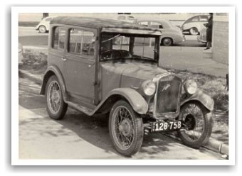 Tony Press' September 1929 Austin 7 Fabric Saloon, body by Holden, outside Caulfield Technical College, Dandenong Road, 1956. Photographer Trevor Boughton.